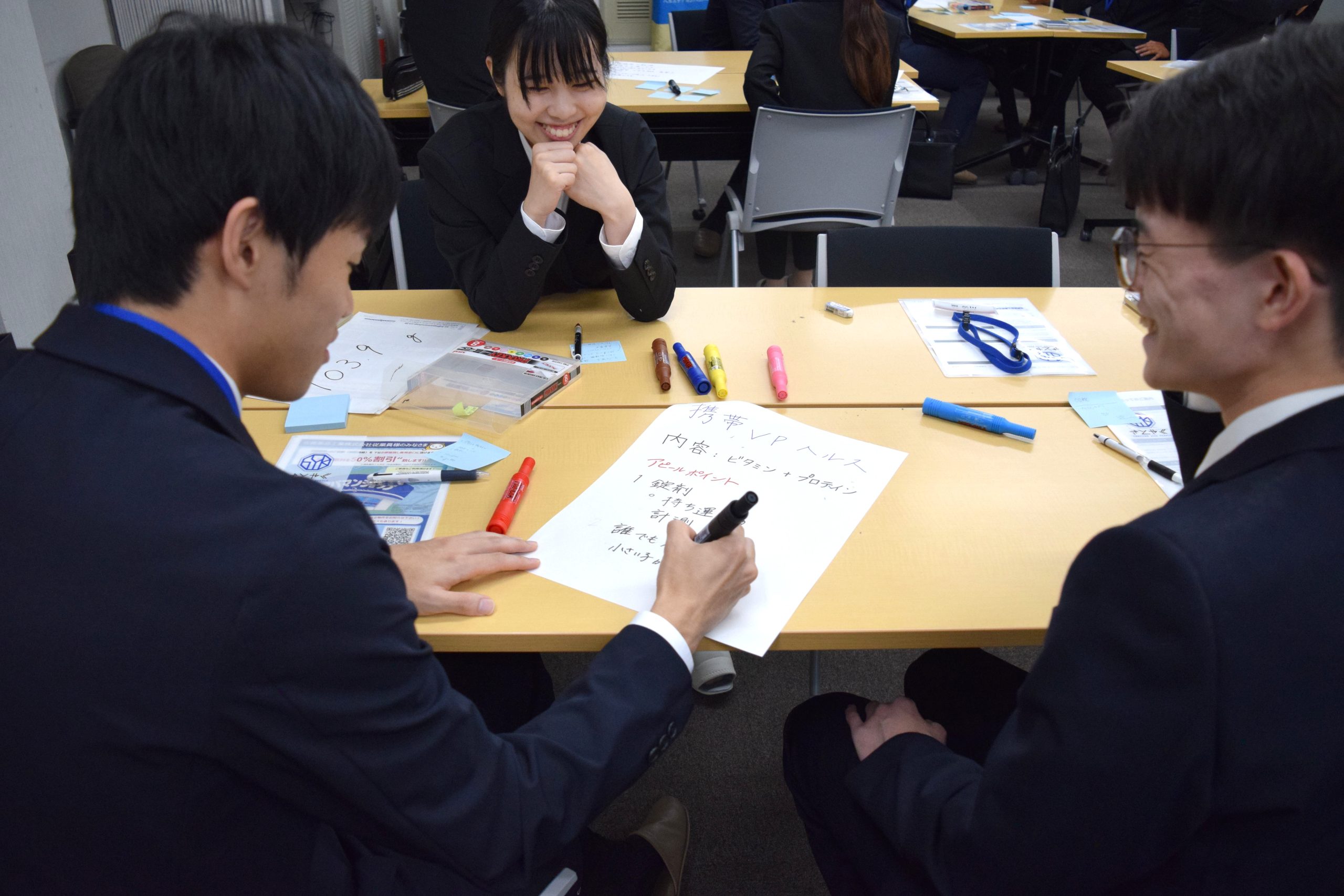 その後、内定者による自己紹介や今後のスケジュールのご案内を行い、グループワークでは「100g計測チャレンジ」や「さとやく新製品の企画発表」に挑戦!